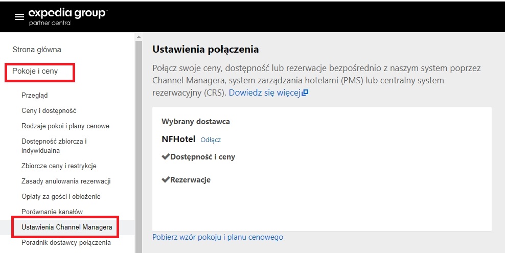 2. W zakładce "Pokoje i ceny" wybieramy "Ustawienia Channel Managera", następnie wyszukujemy NFHotel.