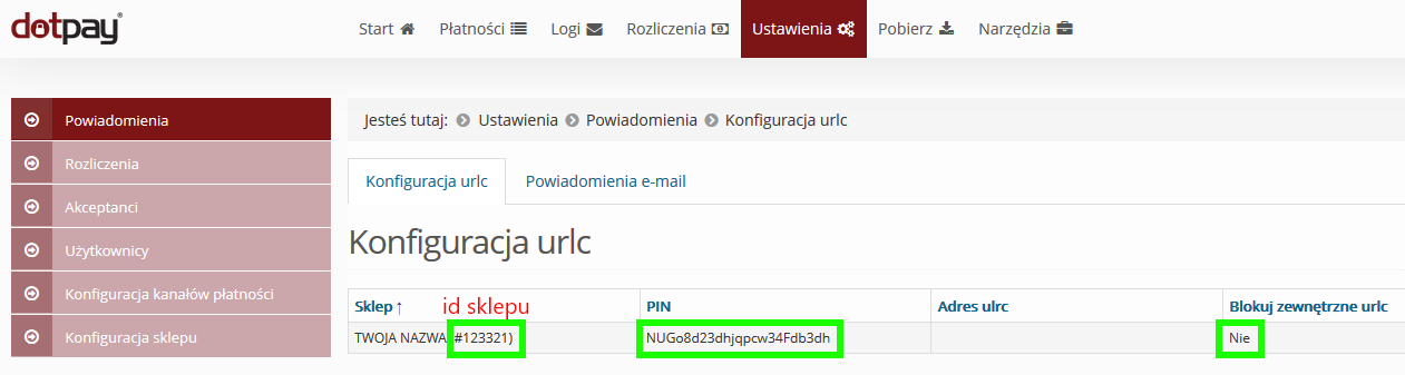 Po otrzymaniu danych do logowania w Dotpay, proszę o przesłanie danych z menu USTAWIENIA: