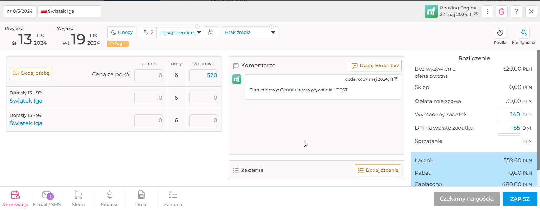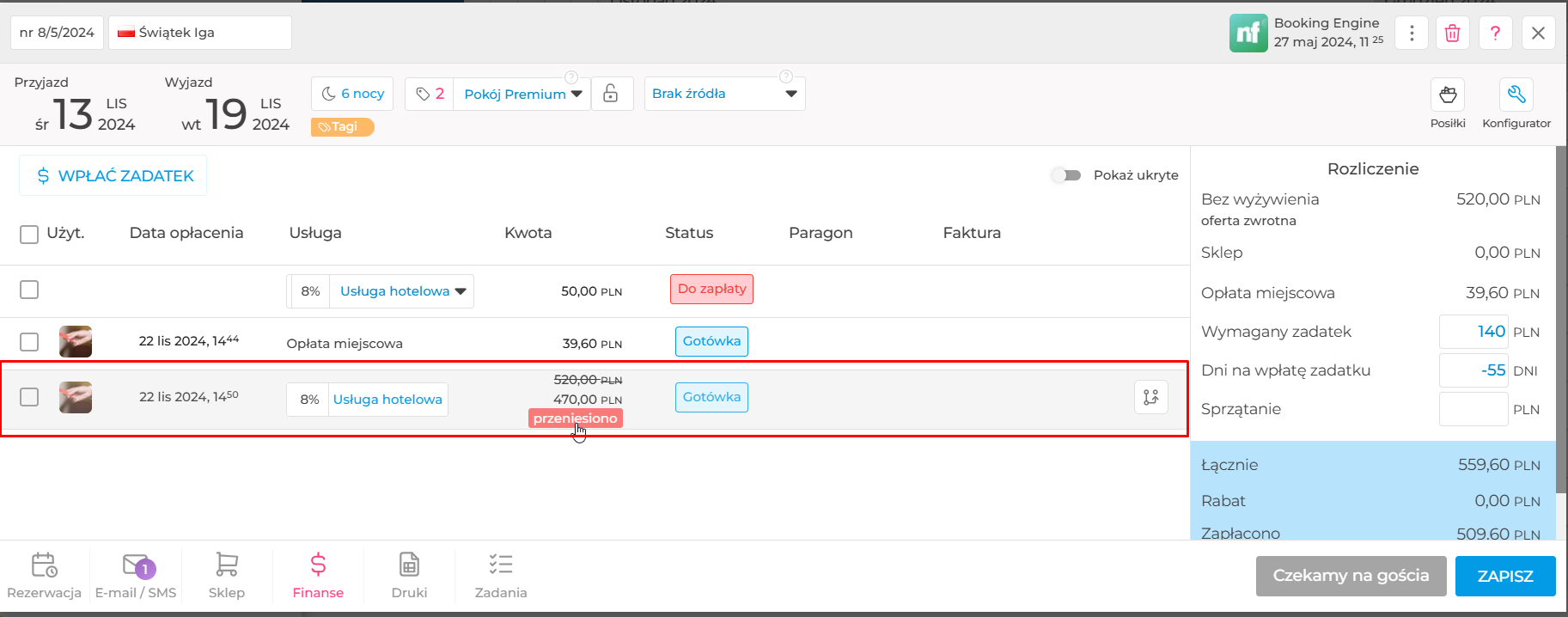 Przejdź do: Okno rezerwacji > Finanse