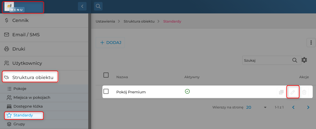 Po zalogowaniu do programu kliknij w Menu > Ustawienia > Struktura obiektu i Standardy. Klikając w ikonę Edycji, możesz edytować dany standard.