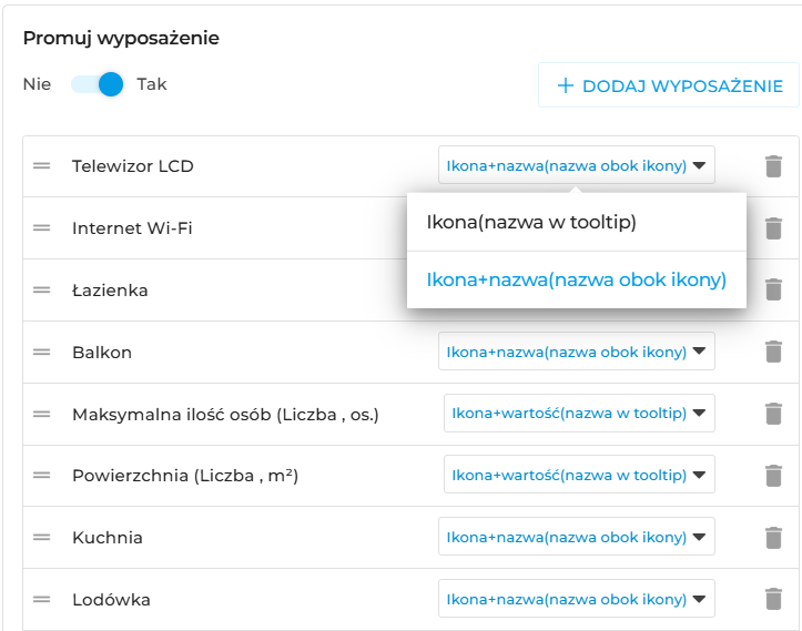 - W tym samym miejscu, w ustawieniach Widgeta (Menu > Booking engine > Widgety > Edycja) znajduje się opcja Promuj wyposażenie którą włączamy.