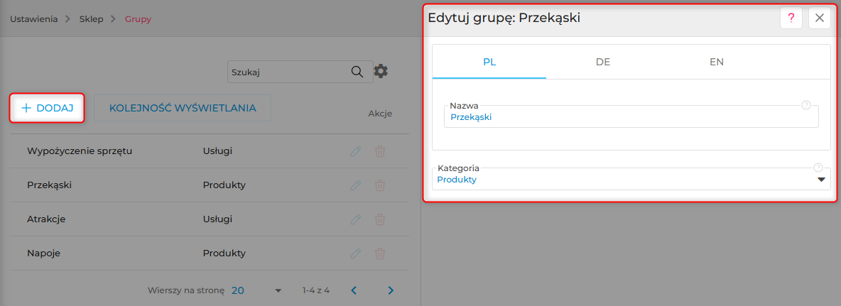 By dodać Grupę, w Menu> Ustawienia > Sklep > Grupy, kliknij w przycisk '+ DODAJ', nazwij grupę i przypisz ją do odpowiedniej Kategorii.