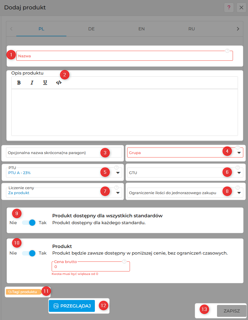 Wybierz czy produkt ma być dostępny czasowo, czy cały czas. Wypełnij również kwotę brutto